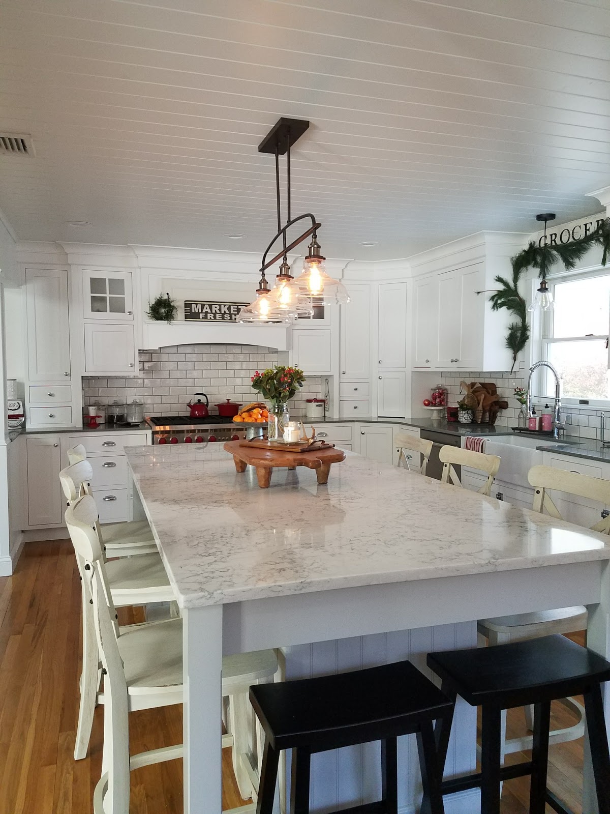It was fun decorating for Christmas in the new kitchen. White is the perfect background for the red to pop! I really don't have a theme to decorating, just what I love. Probably if you had to pick one "theme" it might be "Farmhouse" style.